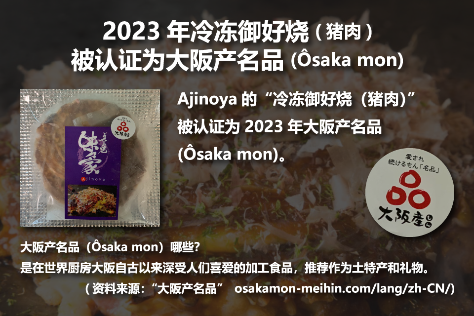 Ajinoya的“冷冻御好烧(猪肉)”被认证为2023年大阪产名品(Ôsaka mon) (osakamon-meihin.com/lang/zh-CN/) 。