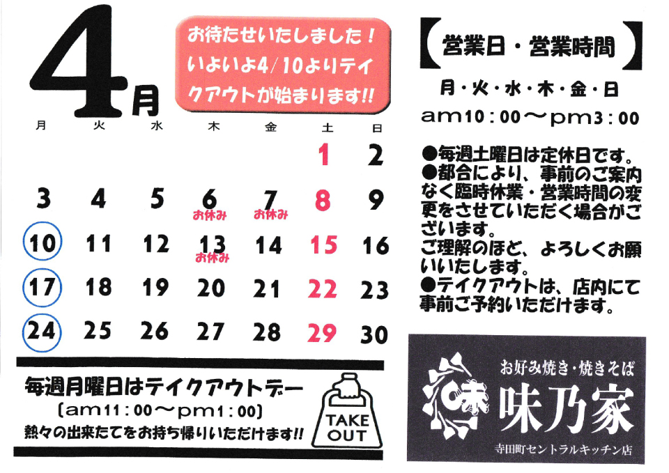 11:00 至 13:00 提供御好烧和炒面外带服务。